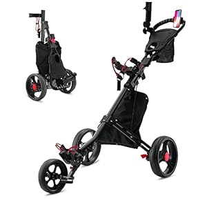 ćPremium Constructionć: This collapsible golf cart is built with a super strong, lightweight, and sturdy aluminum frame that makes the golf pull cart easily maneuverable.27 inch wide body design for effortless pushing, front wheel axel suspension adds extra balance to the cart.Simply tap the break with your foot to engage the brake, then tap with your foot again to release the brake. No need to worry about that the cart will lose control.