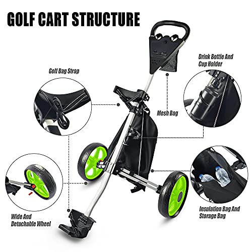 【FEATURES】Wide wheels for stability with clip on mechanism for easy removal;Waterproof scorecard holder,Storage bag,Mesh net,Cup holder,Contoured bottom for larger bags with an adjustable bag strap.