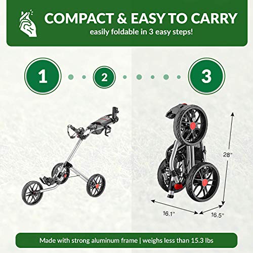 Caddylite 15. 3 V2 is a new generation of golf push carts by CaddyTek. This stylish and advanced push cart will let you stand out on the golf course. The unique light weight and compact folded size make the storage in car trunks easily before or after your round of golf. There are plenty of storage for your personal items and golf essentials such as GPS, tees and golf balls. We ensure golfers can push the cart effortlessly on all terrain with wide body design, multiple handle positions and ball bearing wheels.