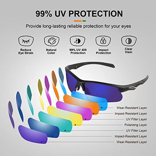 TAC POLARIZED LENS- 100% UV400 protection coating, blocks 100% harmful UVA & UVB Rays. Restore true color, eliminate reflected light and scattered light and protect eyes perfectly. TAC lens includes 7 layers. The 1st layer is polarization layer. The 2nd and 3rd layers are bonding layers to enable durability. The 4th and 5th layers are UV protection layers to absorb UV light. The 6th and 7th layers are shatterproof layers.