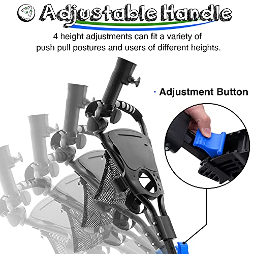 【MATCH YOUR HEIGHT & GOLF BAGS】The soft ergonomic handle with 4 height adjustments is specially designed to fit a variety of push pull postures and users of different heights (teenagers and adults). The adjustable elastic straps of golf push carts can carry most sizes of golf bags.