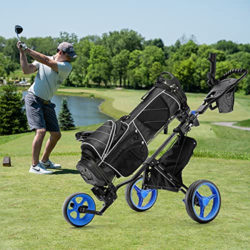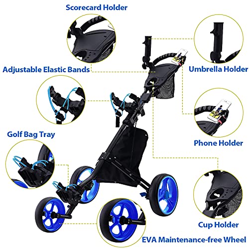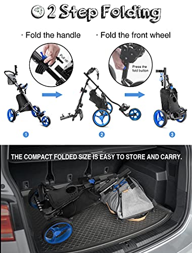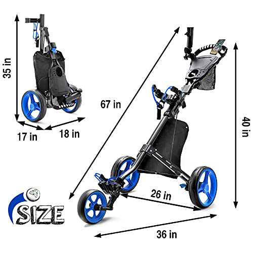 【FOLDING GOLF CARTS】Just 2 steps, you can fold the golf push cart into a compact size for storage. This only takes 5s. And lightweight body of golf cart weighing only 11.2lbs, which is easy to carry. Folded size: 17x18x35Inch.