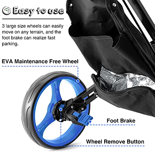 【MADE TO LAST】The frame of 3 wheel folding golf push cart is made of thick aluminum, and the surface has been specially treated that the golf carts has good wear resistance, rust resistance and water resistance. It can accompany you for several years.