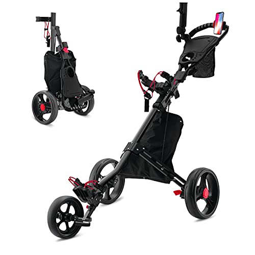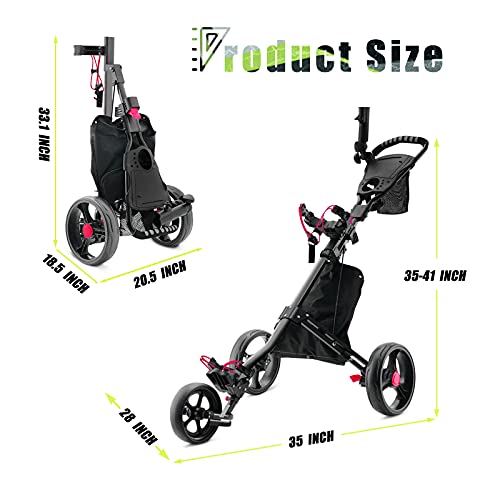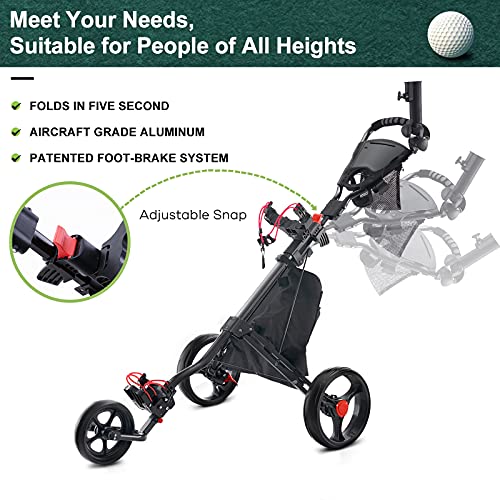 【STRONG & LIGHTWEIGHT ALUMINUM FRAME】 Featuring a heavy-duty aluminum construction, our 3 wheel golf hand cart is very sturdy & durable and so lightweight that only weighs 11 lbs. Equipped with the upper & lower brackets with elastic straps, our golf push pull cart is ideal for any size of golf bag and golf clubs.