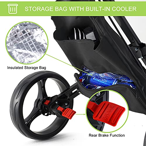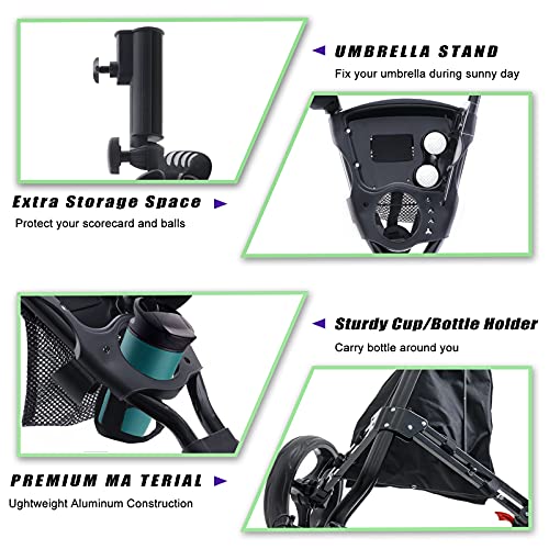 【MULTI STORAGE】 Our foldable golf push cart has sufficient storage space that can store all the needed supplies while golfing: mobile phone holder, bottle holder, adjustable umbrella holder, scorecard case , 2-layer storage bag. The inner one for placing golf equipment, and the outer one with temperature barrier for 3 of 12oz soda and some ice.