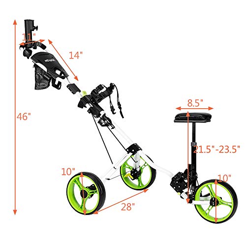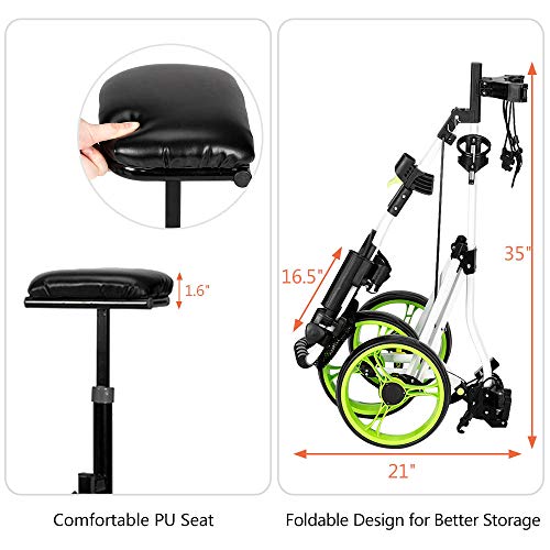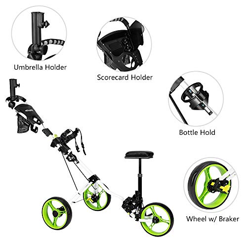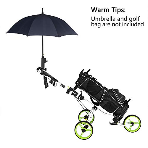 【User-Friendly Design】- This golf push cart features adjustable umbrella holder, scorecard bag and cup holder, all considerate details to make you have a great experience when palying the golf. (Warm tips: Umbrella and golf bag shown in pictures are not included)